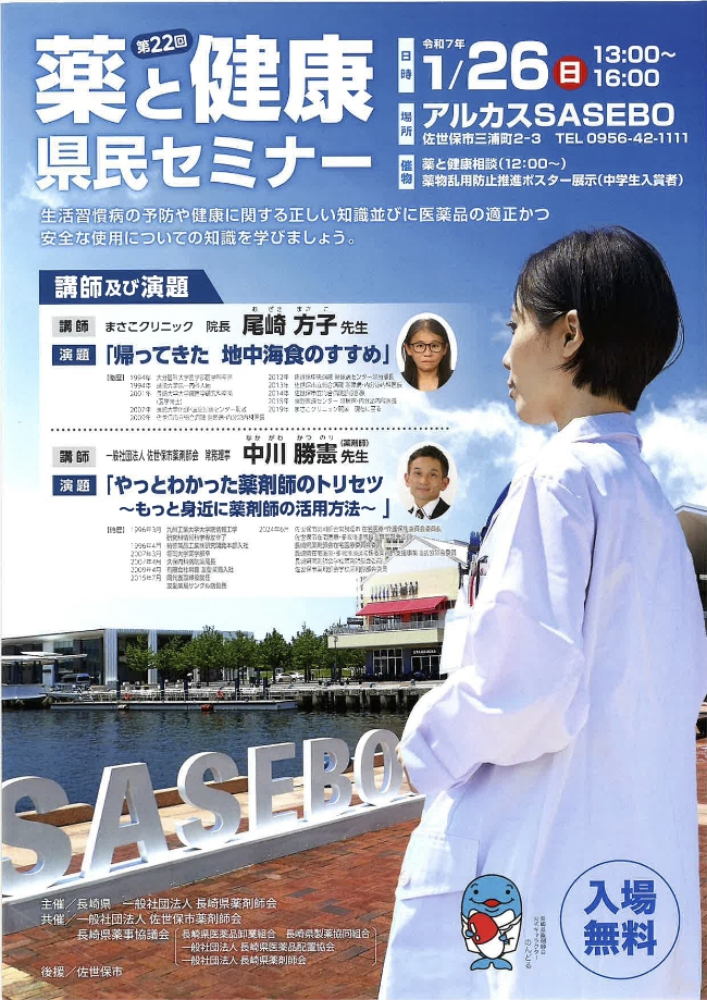 長崎県薬剤師会では、この「薬と健康の週間」にあわせて、長崎県との共催により「薬と健康・県民セミナー」を開催しています。県民の皆さまが、薬や健康について正しく理解し、安心して毎日の生活を送っていただくことを目的としたセミナーです。